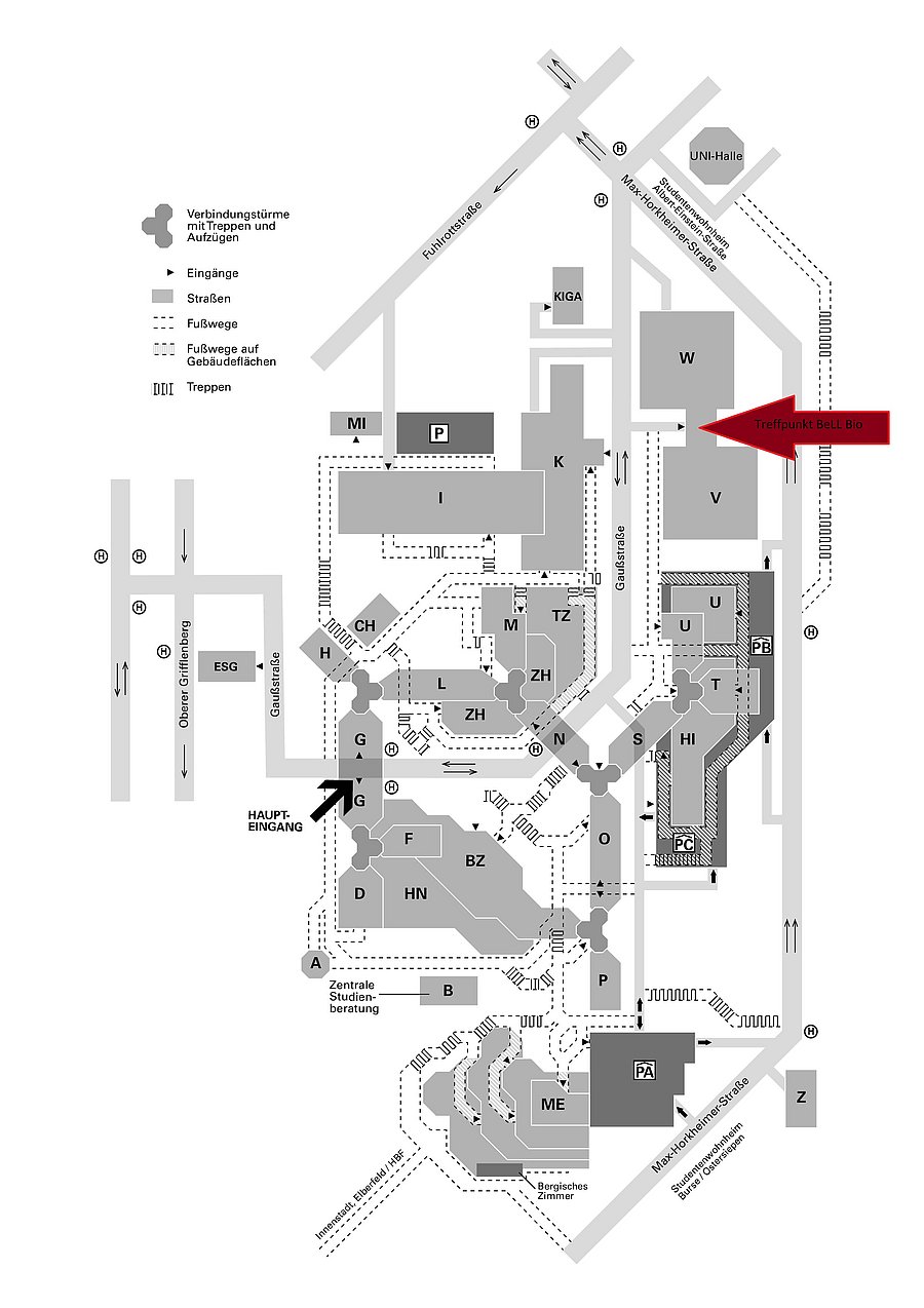 Das Gebäude V (siehe Foto und roter Pfeil im Lageplan) befindet sich gegenüber von Gebäude K auf dem Campus Grifflenberg.